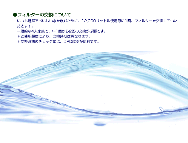 ・フィルターの交換について いつも新鮮でおいしい水を飲むために、12,000リットル使用毎に1回、フィルターを交換していただきます。 一般的な4人家族で、年1回から2回の交換が必要です。 ※ご使用頻度により、交換時期は異なります。 ※交換時期のチェックには、DPD試薬が便利です。